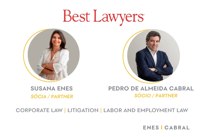 A sócia da Enes | Cabral, Susana Enes, é distinguida na categoria de Corporate Law desde 2019, e o sócio Pedro de Almeida Cabral tem sido reconhecido pelo seu trabalho na área de Litigation desde 2022. Nesta edição, Pedro de Almeida Cabral passou também a integrar a lista da Best Lawyers para a área de Labor and Employment Law.