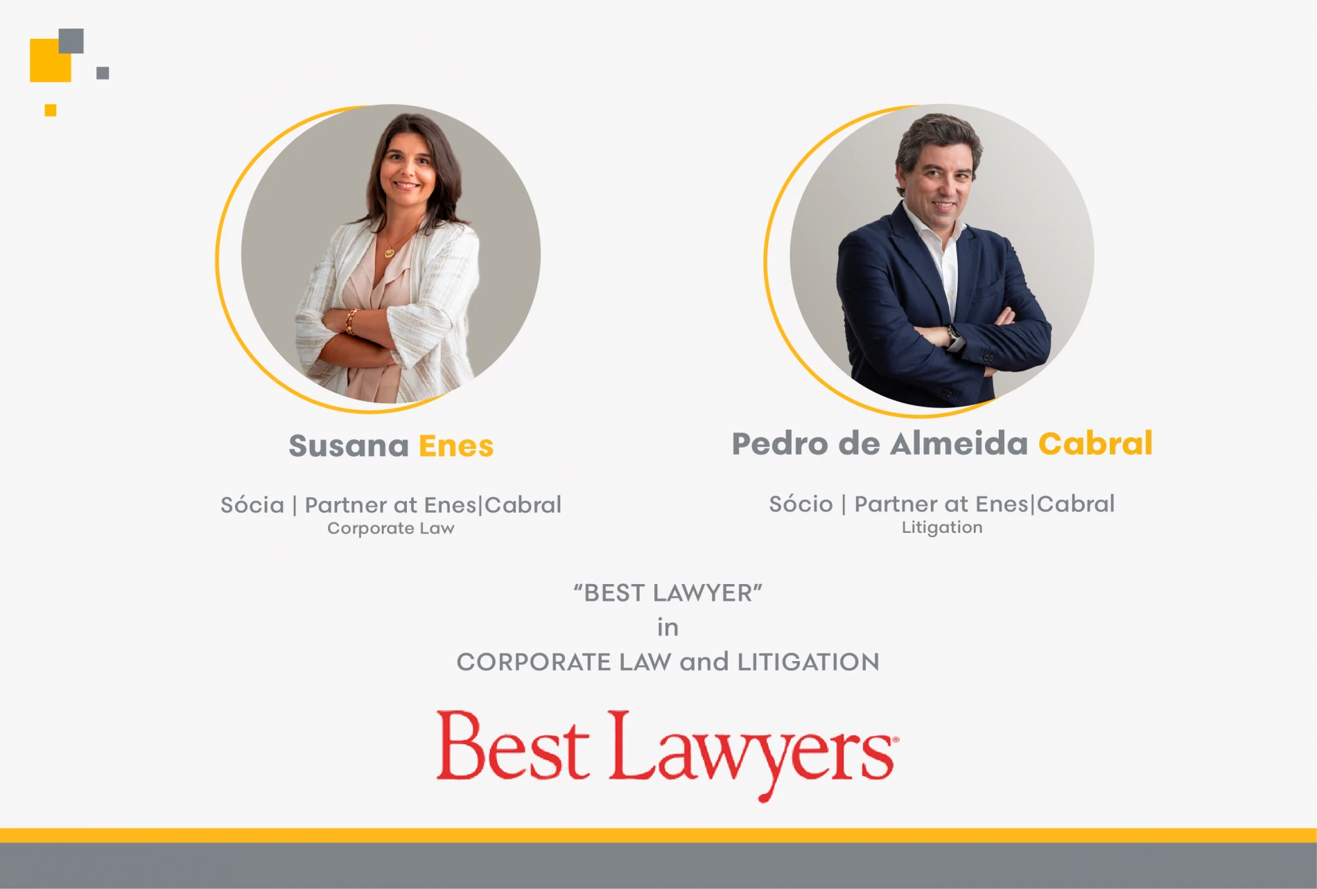Desde 2019 que Susana Enes, responsável pela área de Corporate e M&A, e Pedro de Almeida Cabral, responsável pela área de Contencioso e Arbitragem, vêem a sua prática reconhecida anualmente pela Best Lawyers.